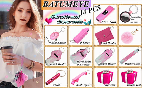 BATUMEYE Gift Set for Woman with Pom Pom Ball, Lip Balm Lanyard, Card Holder, Whistle, Travel Bottle Holder, BottleOpen PinkWhite