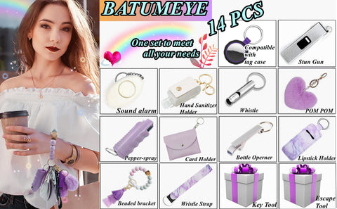 BATUMEYE Gift Set for Woman with Pom Pom Ball, Lip Balm Lanyard, Card Holder, Whistle, Travel Bottle Holder, BottleOpen Purple